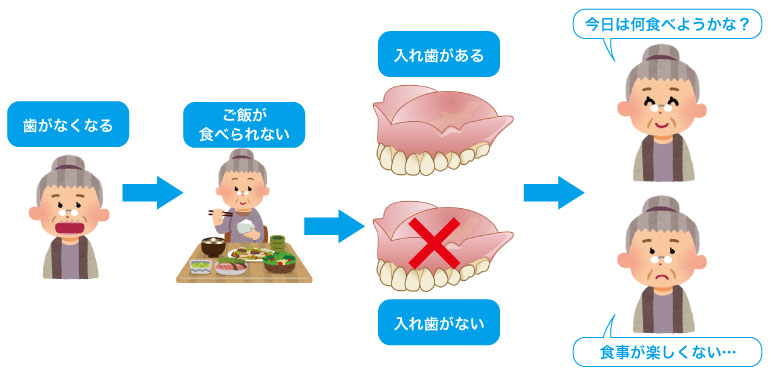 歯が無くなった所に入れ歯を入れず、そのままにすると、食べ物を噛む能力が落ちて、胃腸の調子が悪くなったり、栄養がかたより、 免疫力も低下します。また、歯と歯のすきまが出来ることにより、発音が難しくなり、お喋りがしにくくなります。食事や会話