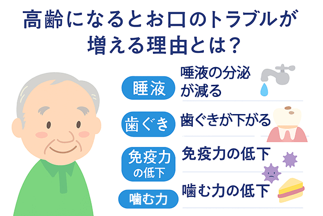 口腔内にいる色々な細菌が、食べ物の残りカスや、逆流した胃液とともに気管に入ると、体力の弱っている 高齢者は誤嚥性肺炎を起こします。
