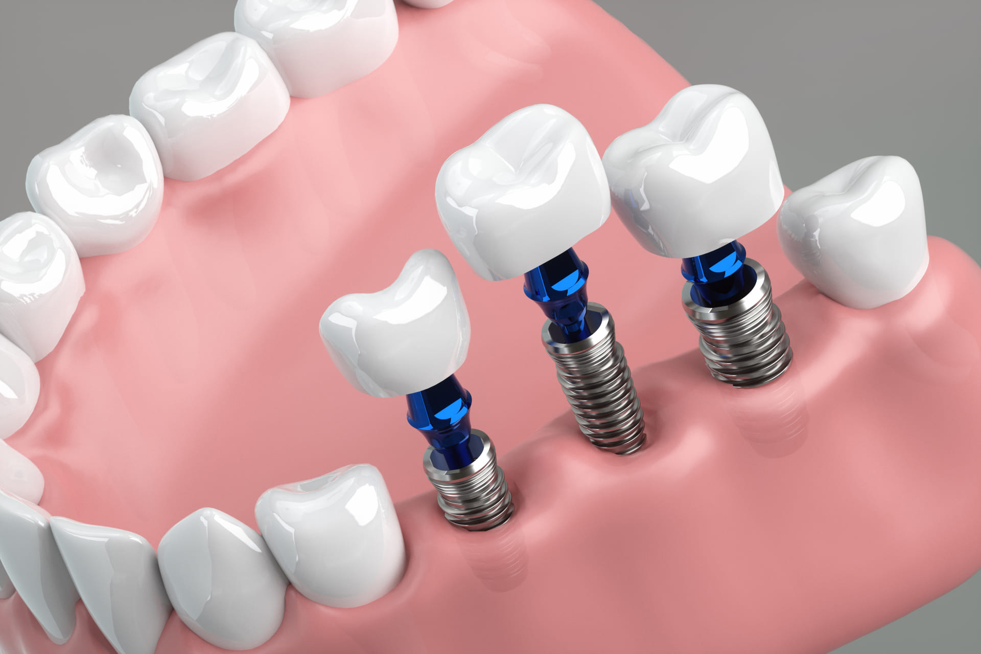 歯科における「インプラント」とは、歯がなくなった際に顎の骨に人工歯根(インプラント体)を埋め込み、それを土台にしてセラミックなどの人工歯を取りつける治療を指します。ブリッジや入れ歯などのほかの補綴治療とは異なり、周囲の健康な歯を削ったり負担をかけたりすることなく、取りつけることができます。顎の骨の状態が良ければ、取りつける本数などに制限がなく、機能性や審美性においても非常に優れている治療法です。